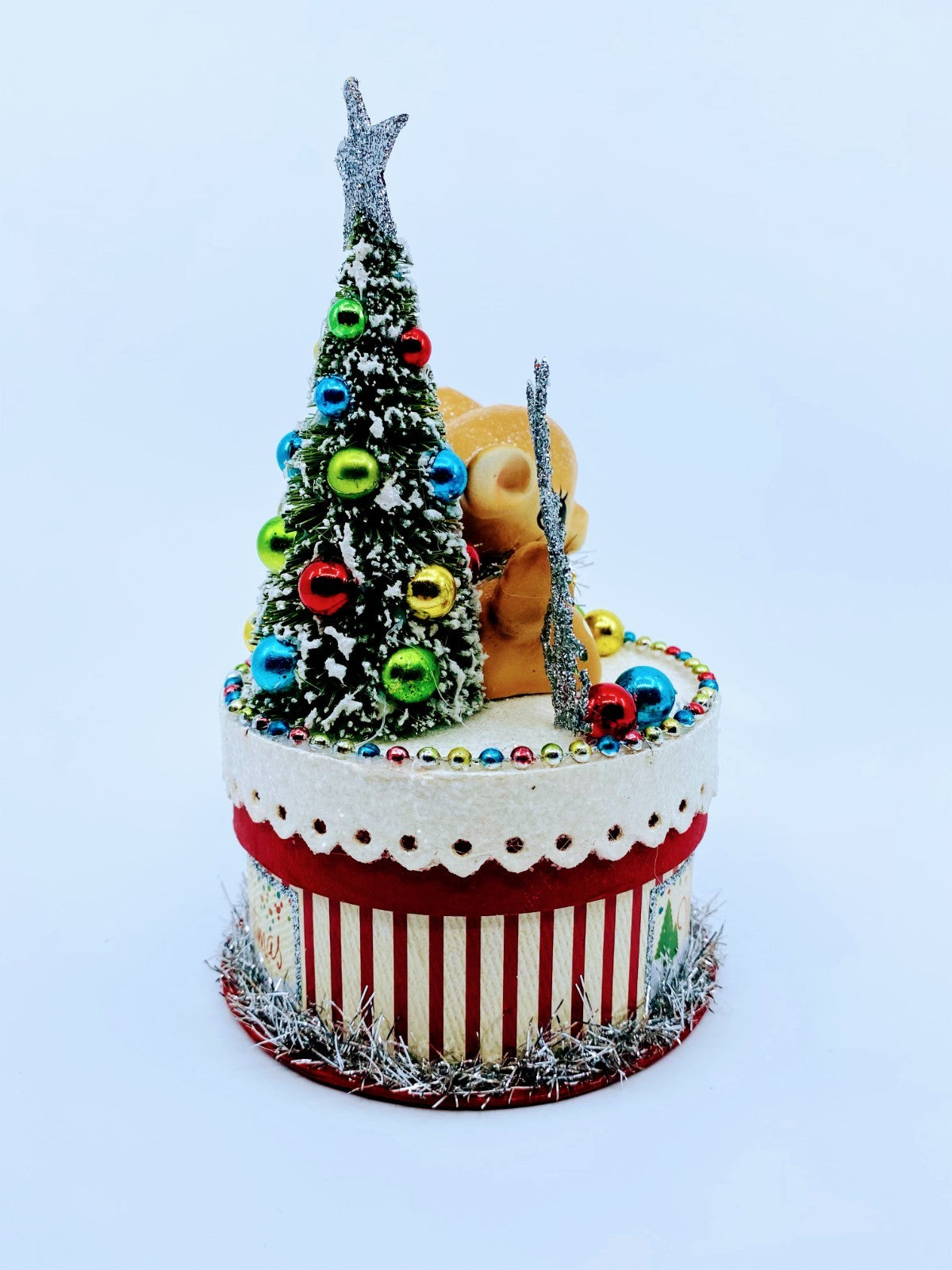 This adorable retro deer is nestled in front of a bottle brush tree with mercury balls. He sits on top of the lid to a container that is adorned with beads and glitter. The pressed paper box is covered with a printed paper image and has silver tinsel around the bottom edge. Bring the magic of Christmas to life in your home with specialty holiday décor by Bethany Lowe Designs.
