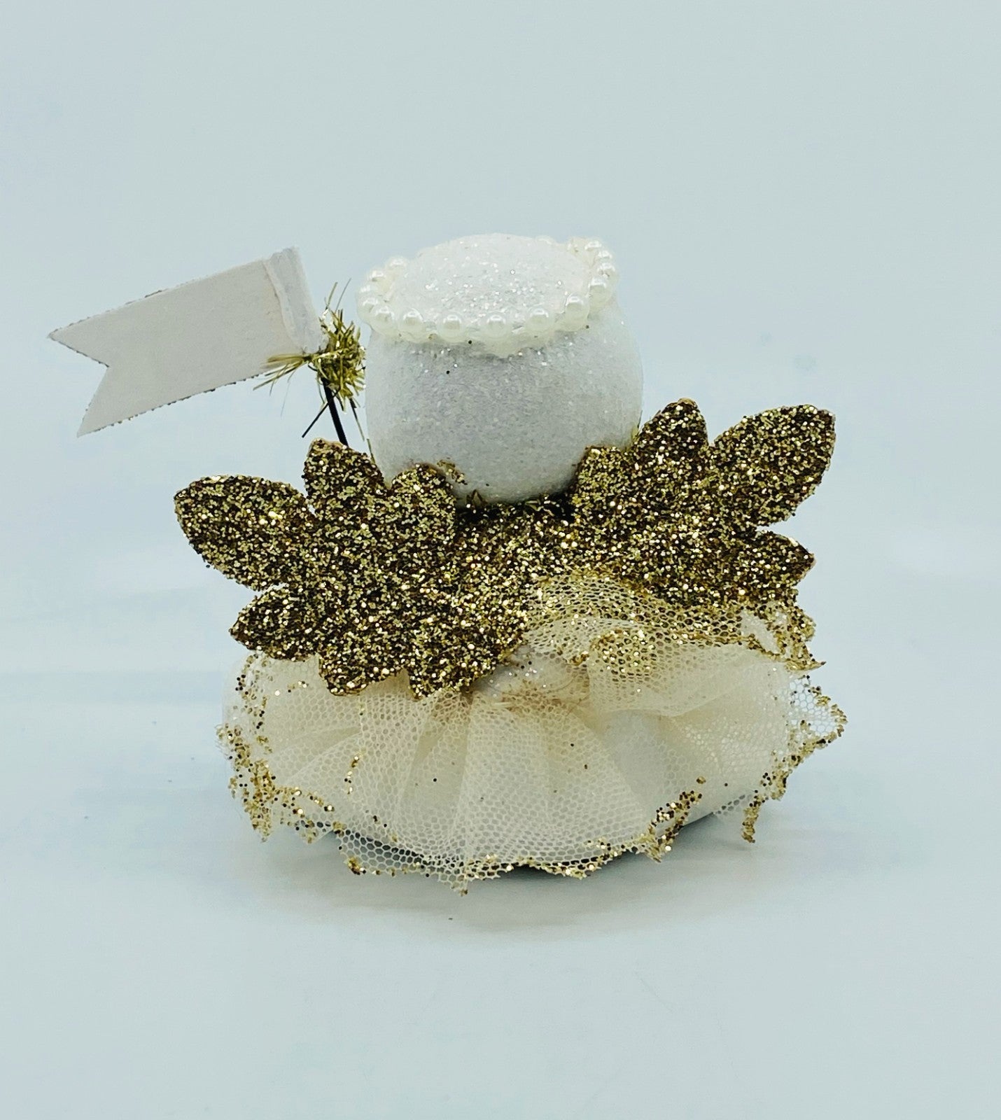 Materials: hand painted resin, tinsel, pressed paper, tulle, beads, and glitter