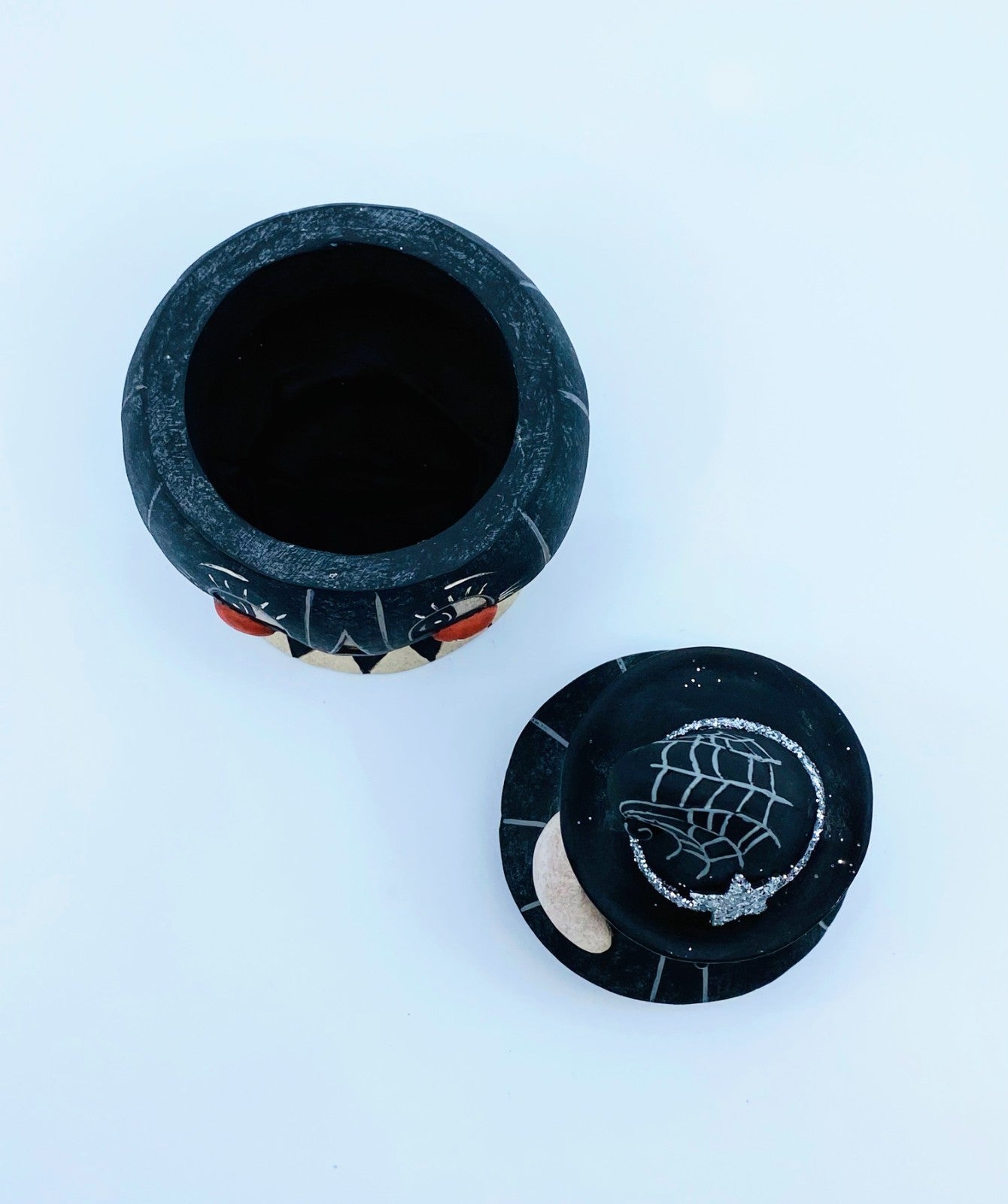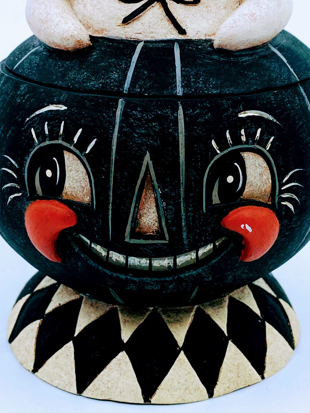 Meet Incognito Gus & Tito, a spooktacular duo from the talented Johanna Parker! Gus, the adorable ghost, peeks out from the top of a mischievous black pumpkin, sporting a cute little witch hat for a charming disguise. Perfect as a Halloween container for sweet treats or standalone decor, this delightful piece brings a touch of vintage-inspired fun and playful mystery to your spooky celebrations!