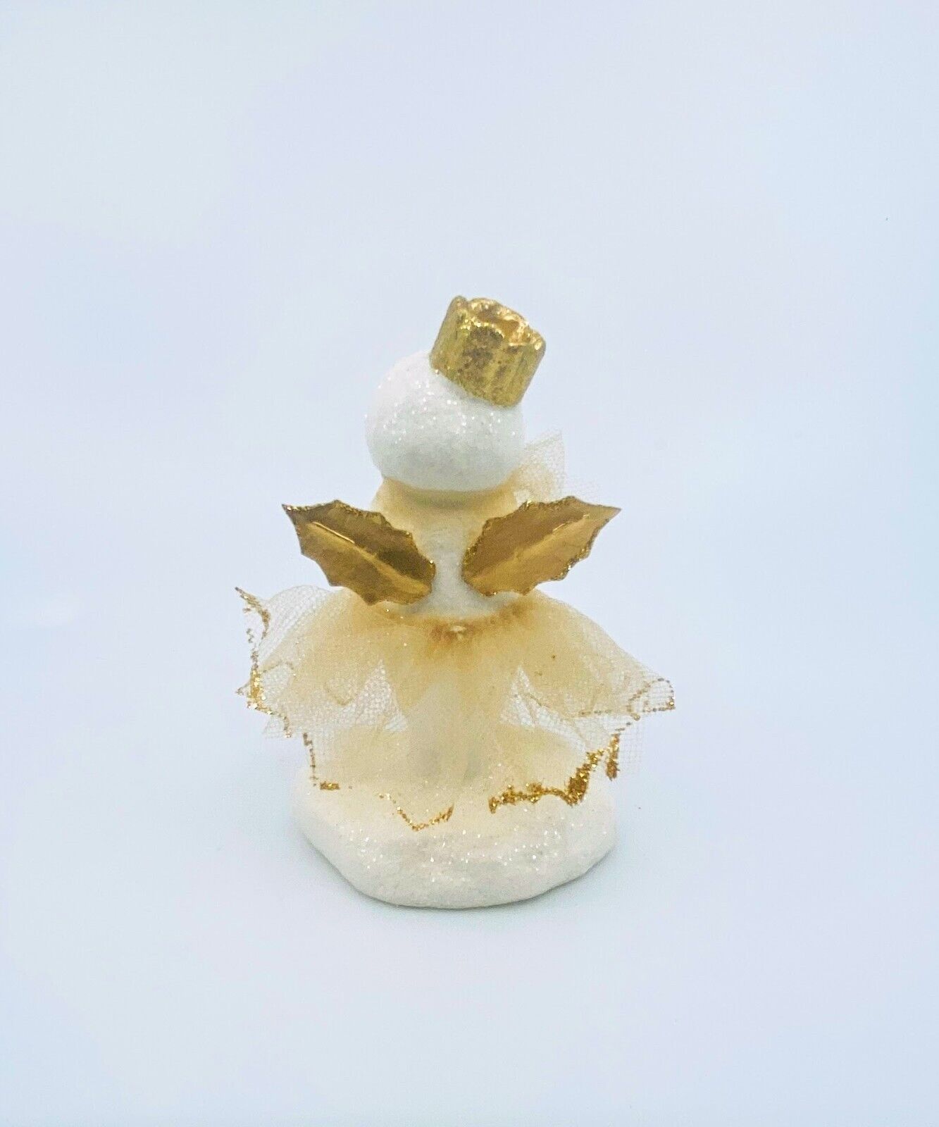 This little snow angel by Michelle Allen of Raggedy Pants Designs is adorned with a dazzling gold glittered crown and metallic gold holly wings. Dressed in a whimsical tulle skirt sprinkled with golden glitter, this festive snowman exudes elegance and holiday charm!