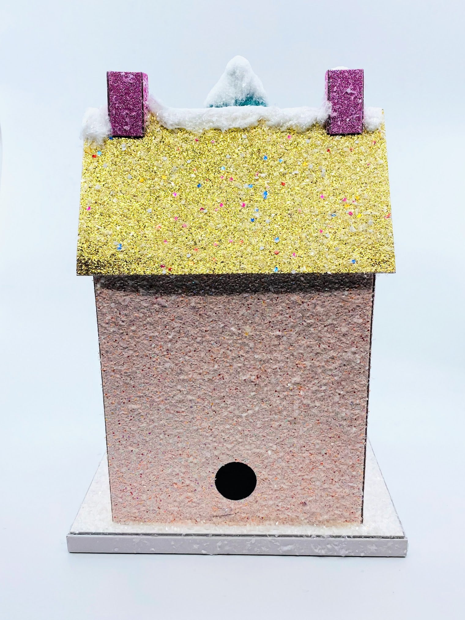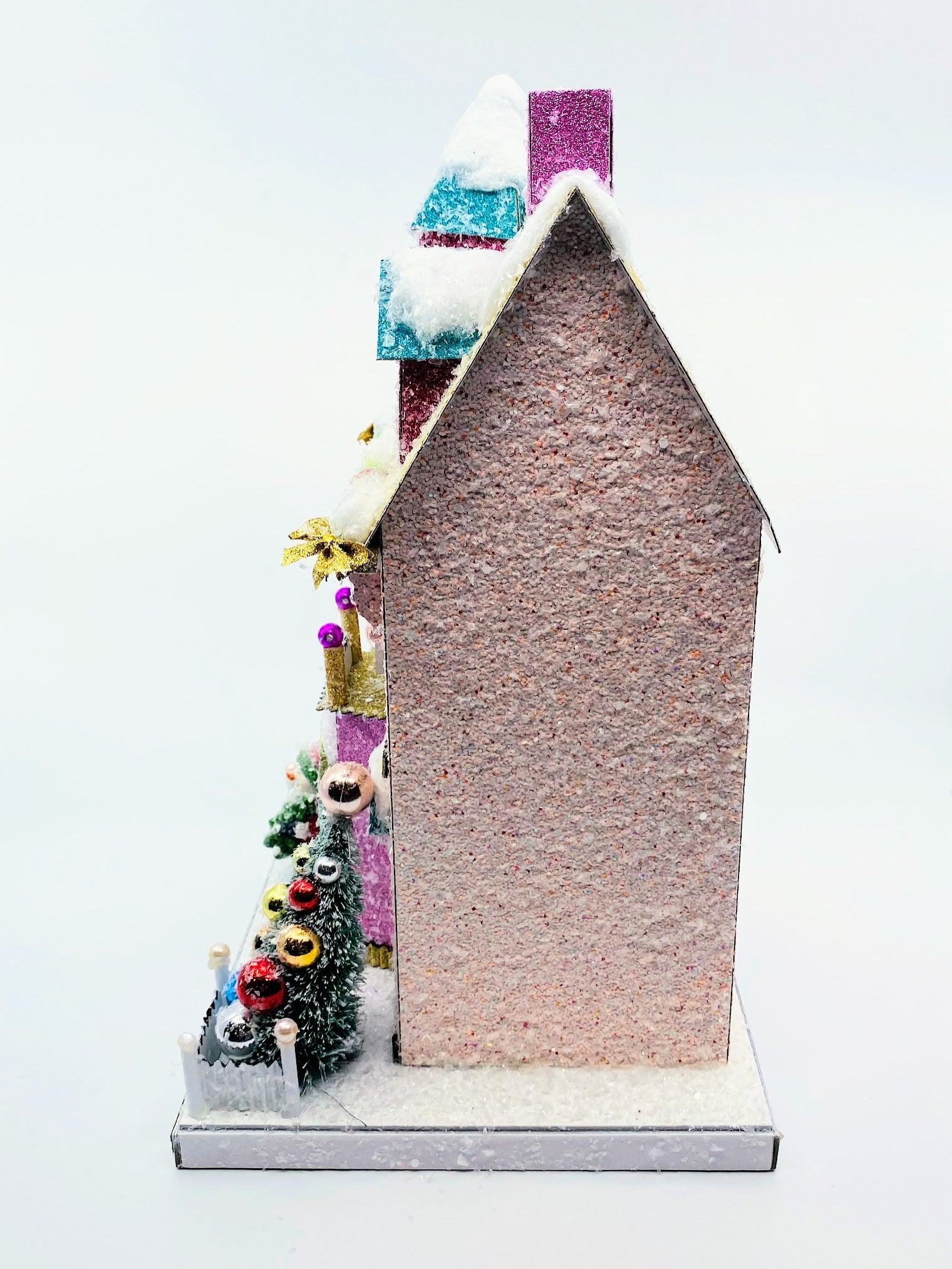 Cody Foster Christmas Village Houses are reminiscent of Charles Dickens or cottages found in an English countryside. They are constructed from pressed paper, hand-painted, and decorated with generous amounts of mica and glitter. Decorative trims can include sisal trees, small resin figurines, cotton batting and other accessories.
