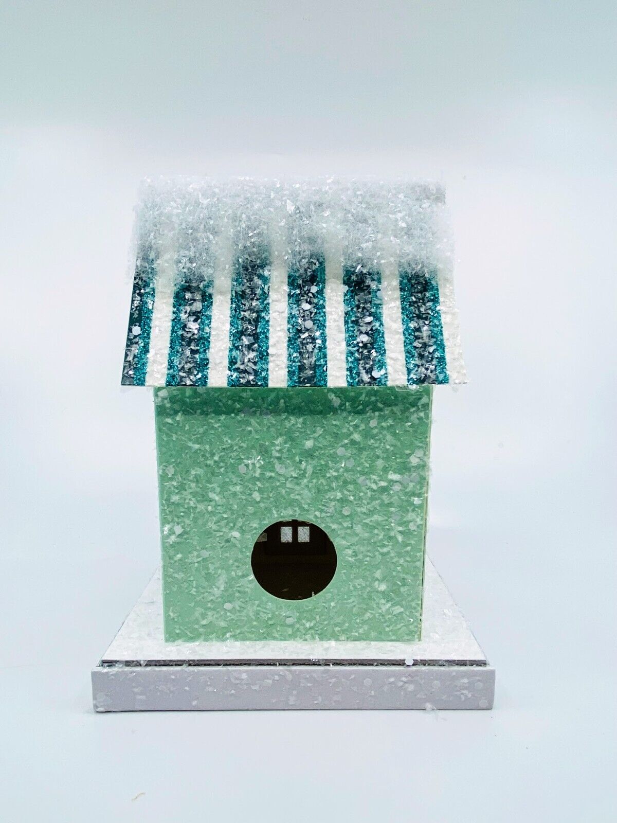 Cody Foster's Christmas houses are constructed from pressed paper, hand-painted, and decorated with generous amounts of mica and glitter. Decorative trims can include sisal trees, small resin figurines, cotton batting and other accessories.
