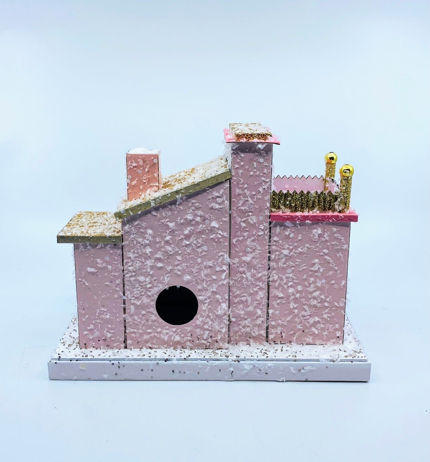 Cody Foster's Christmas houses are constructed from pressed paper, hand-painted, and decorated with generous amounts of mica and glitter. Decorative trims can include sisal trees, small resin figurines, cotton batting and other accessories.