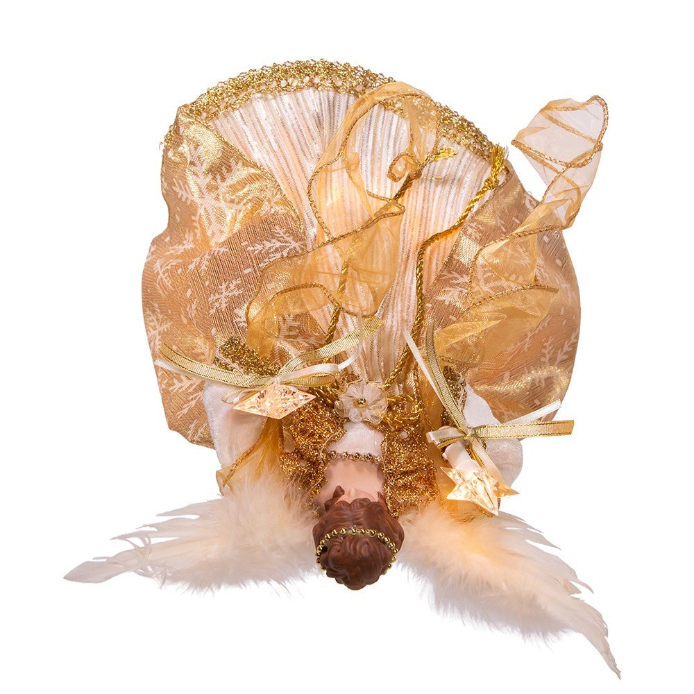 Add the perfect finishing touch to your Christmas tree with this Gold Angel treetop from Kurt Adler. This beautiful angel is wearing an a stunning gold gown with gold brocade trim and gold ribbons accented by large white feather wings.