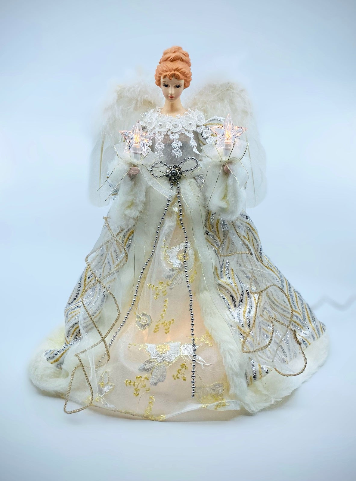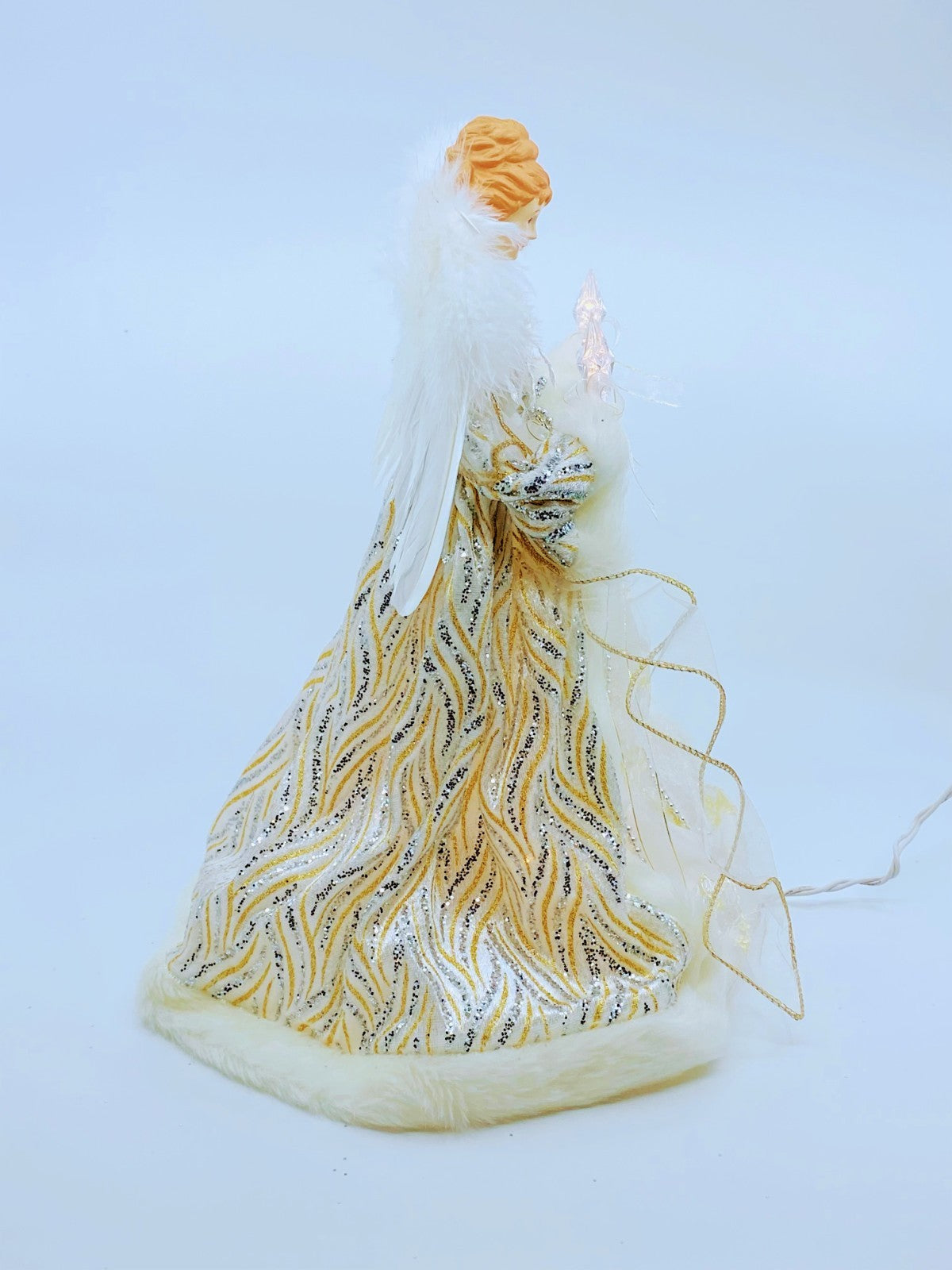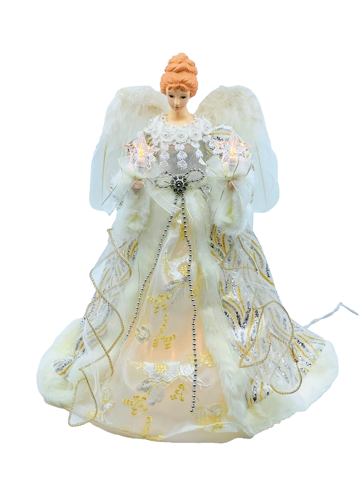 Kurt Adler's gold and silver lighted angel treetop is a beautiful addition to any holiday décor or Christmas tree. This angel is wearing a silver and gold dress with feathered wings. In her hands she is holding stars and when plugged in she is pre-lit by 10 clear incandescent bulbs.