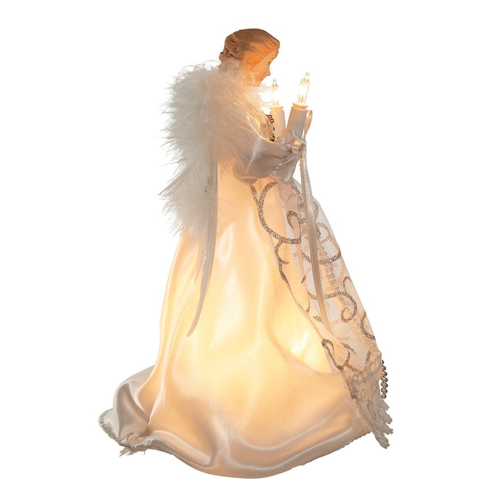 Add to the lighting and décor of your Christmas tree with Kurt Adler's white and silver angel treetop. This beautiful angel is dressed in a snow-white gown with silver accents. She is lighted from within her dress and her candles. This is sure to be the perfect finishing touch to any tree.